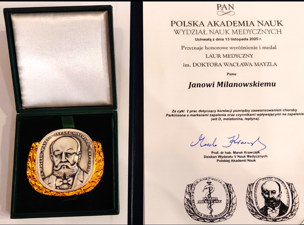 Z przyjemnością informujemy, że Jan Milanowski, student VI roku kierunku Lekarskiego Collegium Medicum UMK oraz wieloletni członek Studenckiego Koła Naukowego Biologii i Biochemii Medycznej, działającego przy Katedrze Biologii i Biochemii Medycznej, został w dniu 27 listopada 2025 r. uhonorowany prestiżowym wyróżnieniem „Laur Medyczny im. Doktora Wacława Mayzla”, przyznawanym przez V Wydział Nauk Medycznych Polskiej Akademii Nauk.