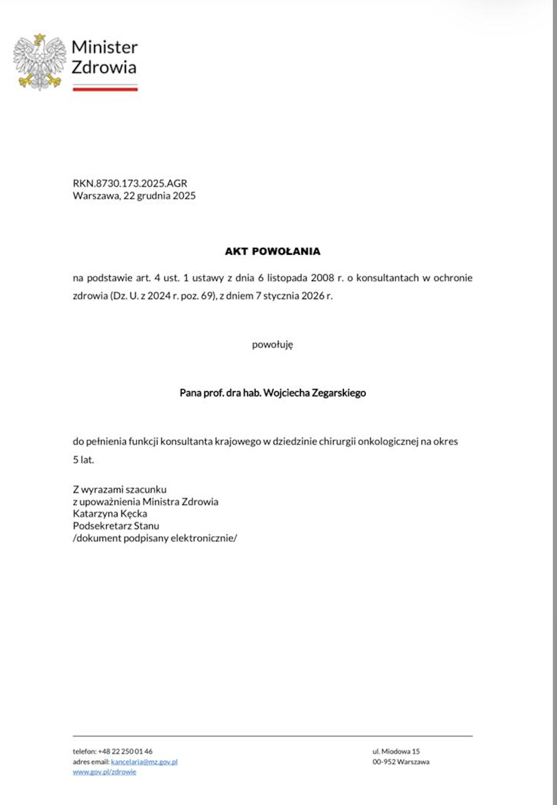 Profesor Wojciech Zegarski konsultantem krajowym w dziedzinie chirurgii onkologicznej